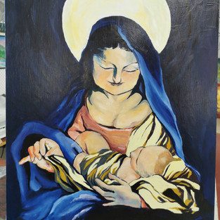 I admit to using most of my cheapest acrylics on this one. I was unsure of working on the wood and hadn't really applied an idea as explicitly before. In the interest of experimenting, I definitely compromised on materials, and struggled to work in faster drying acrylic on a larger scale. Similar cuts were made around the halo, which I might fix at a later stage. It helped to work in sections, first with the background and cloak, then the skin and figures. I tried to keep a cooler skin tone shade. A lot of earlier Byzantine scenes depicting Mary and Jesus have a slight green tinge, as the flesh tones have eroded over time. It also gave a potentially uneasy feeling to the picture.